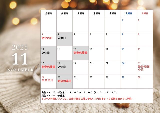 お知らせ news 魚時会館おさかな亭|静岡県藤枝市で宴会・出前・法事・仕出し弁当 > お知らせ > 営業日のご案内(11月) 営業日のご案内(11月) 11月の営業をご案内させていただきます。尚、臨時休業の場合は、別途お知らせいたします。 新着情報 2025/10/27 営業日のご案内(11月) 2025/10/25 臨時休業のお知らせ(10月28日) 2025/07/25 【重要なお知らせ】営業形態変更のご案内(2025年8月より) 一覧を見る 2018/11/17 魚時のおせち「祝箱」予約受付開始! 2018/10/10 忘年会&新年会特別コースのご紹介 一覧を見る