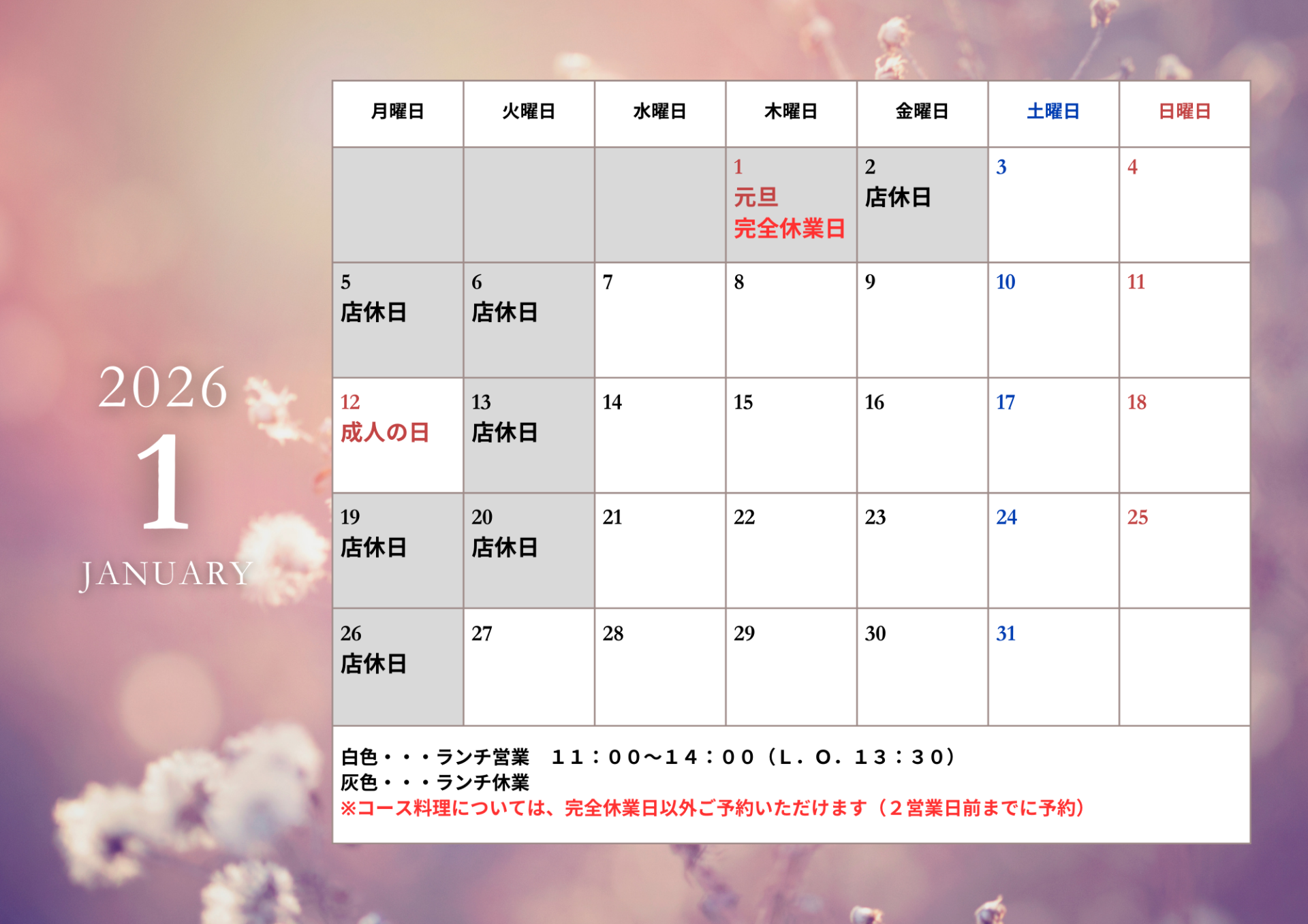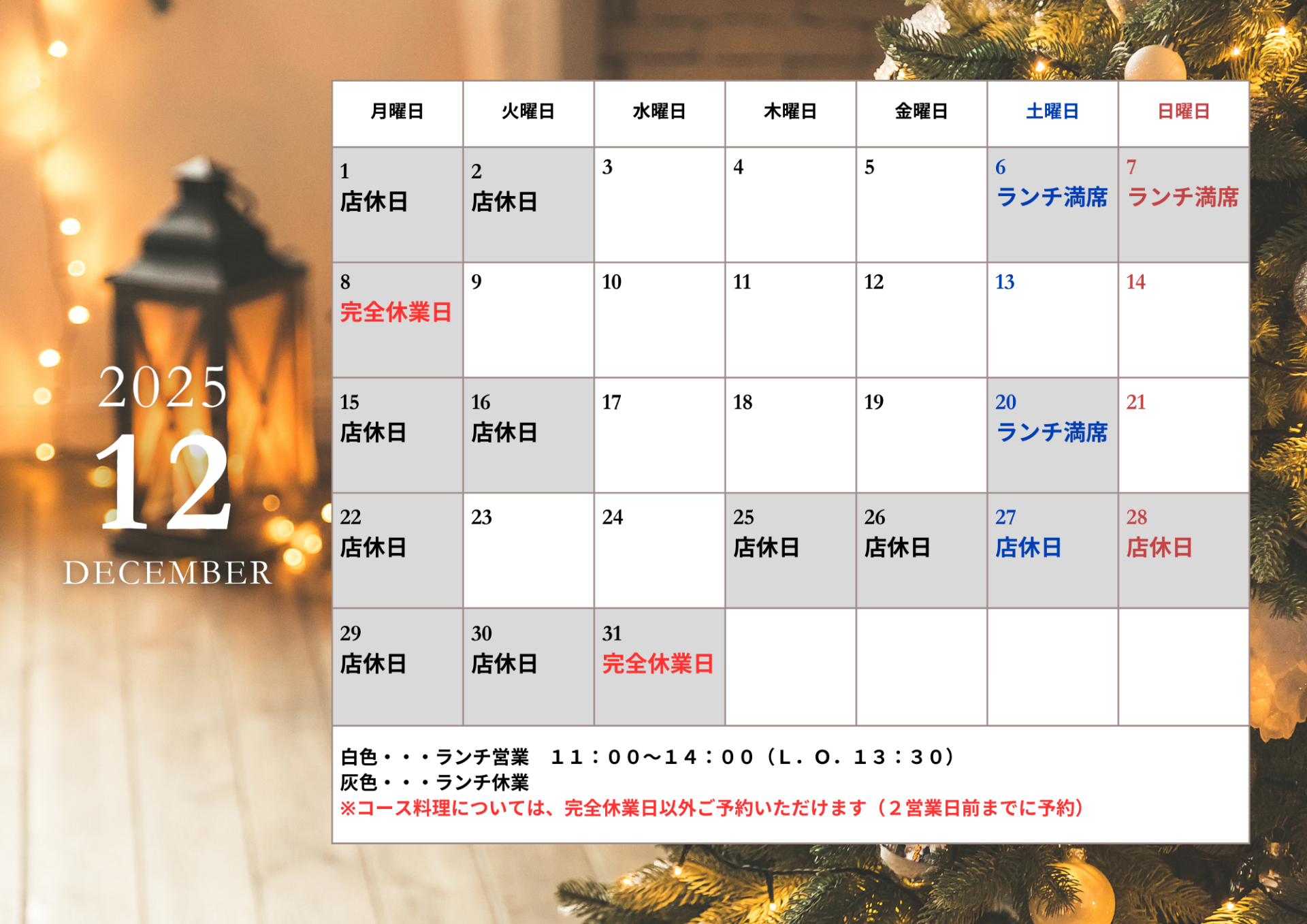 お知らせ news 魚時会館おさかな亭|静岡県藤枝市で宴会・出前・法事・仕出し弁当 > お知らせ > 営業案内(12月・1月) 営業案内(12月・1月) 2025年12月、2026年1月の営業をご案内させていただきます。尚、臨時休業の場合は、別途お知らせいたします。 新着情報 2025/12/03 営業案内(12月・1月) 2025/11/03 年末・正月用品のご予約について 2025/11/03 魚時のおせち(2025年) 販売開始のお知らせ 一覧を見る 2018/11/17 魚時のおせち「祝箱」予約受付開始! 2018/10/10 忘年会&新年会特別コースのご紹介 一覧を見る