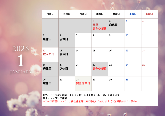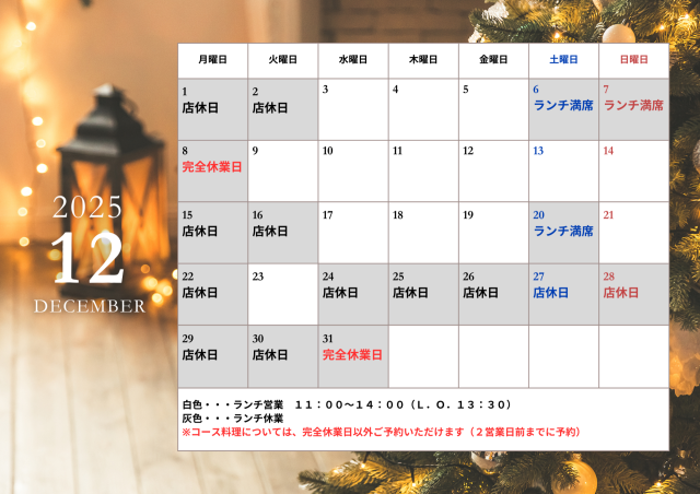 お知らせ news 魚時会館おさかな亭|静岡県藤枝市で宴会・出前・法事・仕出し弁当 > お知らせ > 営業案内(12月・1月)※12月21日更新 営業案内(12月・1月)※12月21日更新 2025年12月、2026年1月の営業をご案内させていただきます。尚、臨時休業の場合は、別途お知らせいたします。 新着情報 2026/01/01 謹んで新春のお慶びを申し上げます 2025/12/31 【御礼】本年の営業と、年始の営業につきまして 2025/12/29 年末年始の営業のご案内 一覧を見る 2018/11/17 魚時のおせち「祝箱」予約受付開始! 2018/10/10 忘年会&新年会特別コースのご紹介 一覧を見る